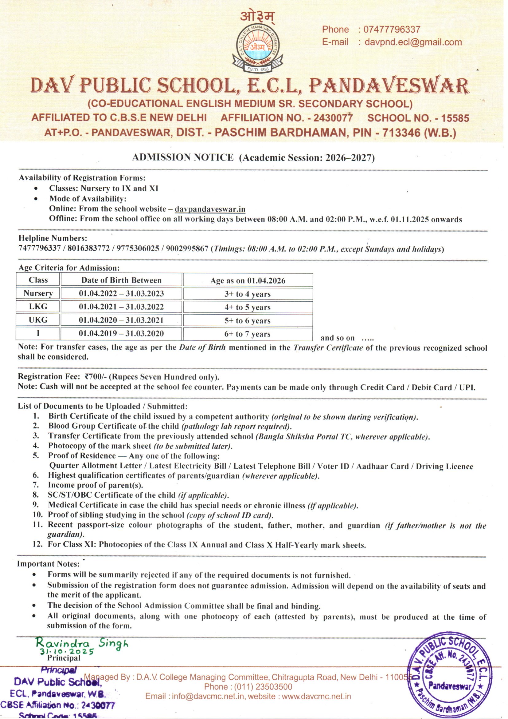 DAV PUBLIC SCHOOL- ECL, PANDAVESWAR POST- PANDAVESWAR, BURDWAN, WEST BENGAL-713346 PHONE:+91-7477796336,37,38,39,40 E-MAIL:[email protected], [email protected]